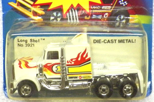 White, w/Yellow, Red, & Black tampos, stripes, flames, & race deco on sides, stripes on hood & air dam, Dk. Red interior, Clear Window, Chrome Malaysia Base, w/BW's