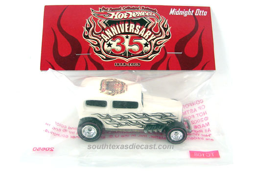 Pearl White & Black, w/Red, Yellow, & Blue flames on sides, 'Early Times Mid-Winter Rod Run' on roof, '2002' & HW logo on rear, Black Malaysia Base, w/RR's