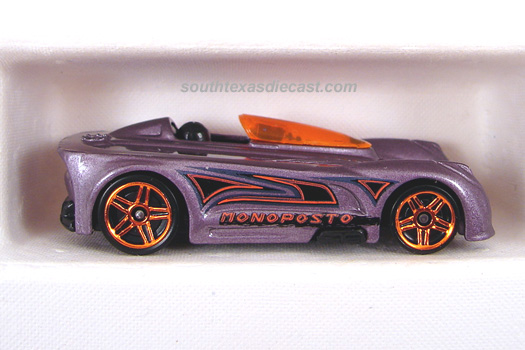 Mtflk. Lt. Purple, w/Black, Orange, & Blue stripes & 'Monoposto' on sides, Black Malaysia Base, w/ChrOrangePR5's