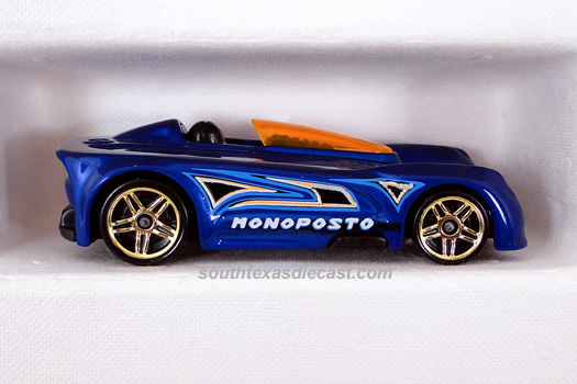 Dk. Blue w/Black, White, Orange, & Blue stripes & 'Monoposto' on side, Black Malaysia base, w/GoldPR5's
