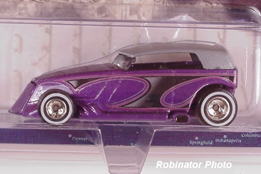Mtflk. Purple, w/Tan roof, Yellow, Red, Blue, & Black tampos, lightning flames on sides, 'Early Times Mid-Winter Rod Run' & '2000' on roof, Black interior, Unpainted Malaysia Base, w/RR's