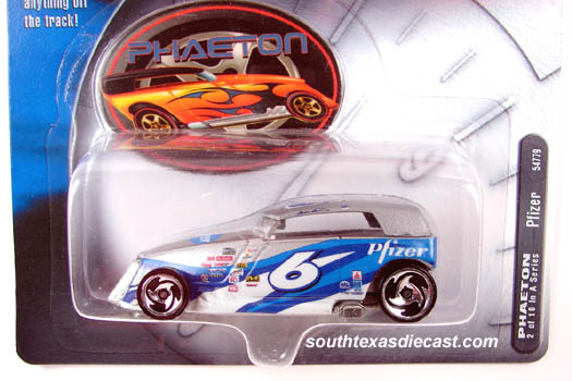 Mtflk. Silver, w/Silver roof, Blue, Dk. Blue, & White stripes, 'Pfizer' on sides & rear, Pfizer logo on hood, '6' on sides, roof, & rear, race deco on sides, White Interior, Unpainted Thailand Base, w/SB's