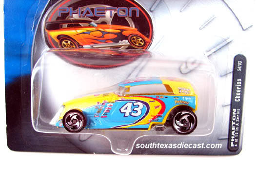 Yellow & Lt. Blue, w/Lt. Blue & Yellow roof, Dk. Blue, Yellow, & Red stripes, 'Cheerios' on hood & rear, Betty Crocker logo on hood, 'Chex' on roof, '43' on sides, roof, & rear, race deco on sides, White Interior, Unpainted Thailand Base, w/SB's