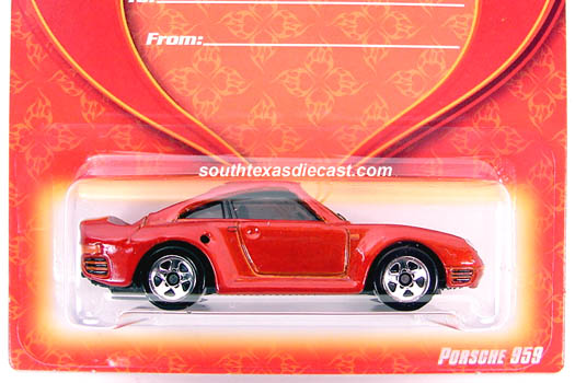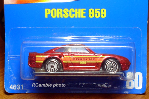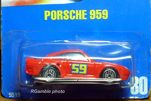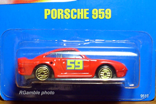 Mtflk. Red, w/Orange & Yellow stripes on sides & across top, 'Porsche 959' on sides & hood, Tan interior, Clear Window, Unpainted Malaysia Base, w/UH's