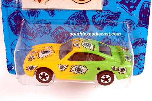 Mtflk. Purple, w/Yellow, Lt. Purple, & Pink deco, Yellow lines on sides, hood, & roof, Grey '5' on sides, Yellow 'Porsche' on hood, Chrome window, Unpainted Malaysia Base, w/ChromeHO's