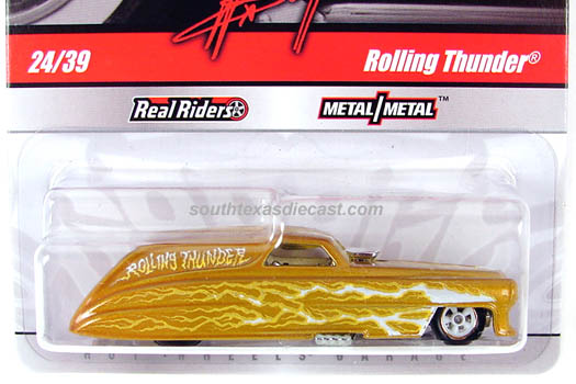 Mtflk. Gold, w/White & Yellow flames on sides & across top, 'Rolling Thunder' on sides, Chrome Interior, Unpainted Malaysia Base, w/Gold/WhiteRR5SP's