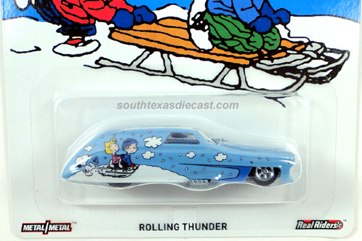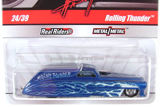 Mtflk. Blue, w/White & Blue flames on sides & across top, 'Rolling Thunder' on sides, Chrome Interior, Unpainted Malaysia Base, w/RR5SP's
