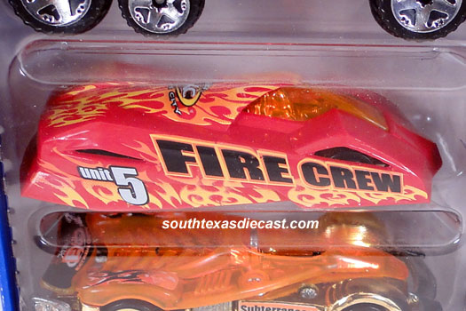Red, w/Black, Orange, Yellow, & White tampos, 'Fire Crew' & 'Unit 5' on sides, flames on sides & across top, Chrome interior, Unpainted Malaysia Base, w/Black5SP's