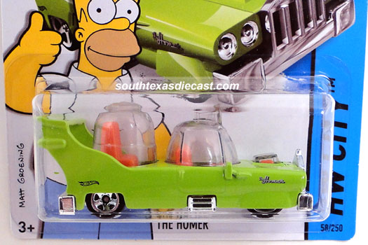 Lime Green, w/Silver 'The Homer' on sides, painted headlights & taillights, Orange Interior, Unpainted Malaysia Base, w/RR's
