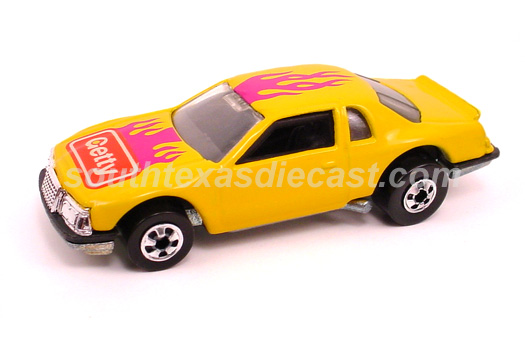Yellow, w/Magenta flames on hood & roof, Red & White Getty logo on hood, Black interior, Clear Window, Unpainted Malaysia Base, w/BW's
