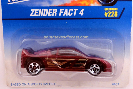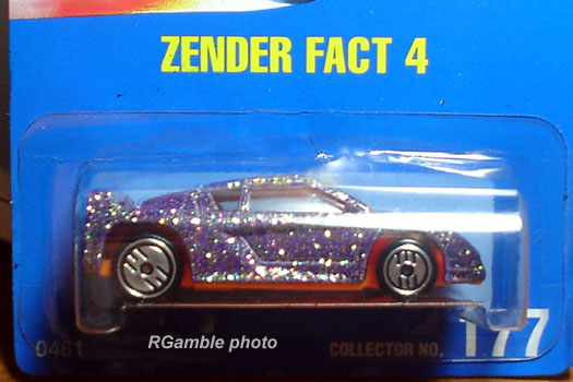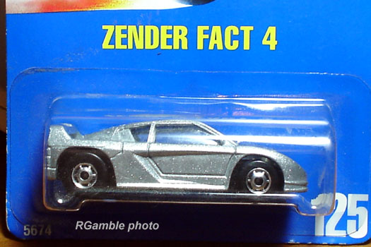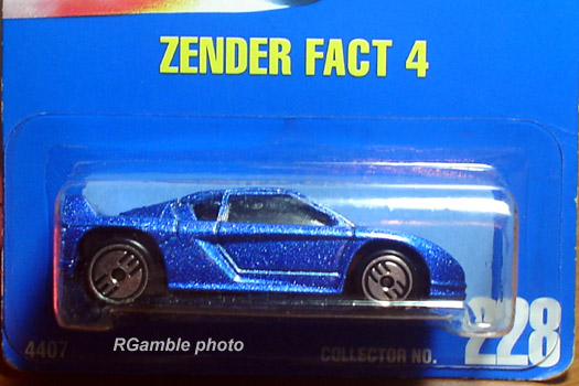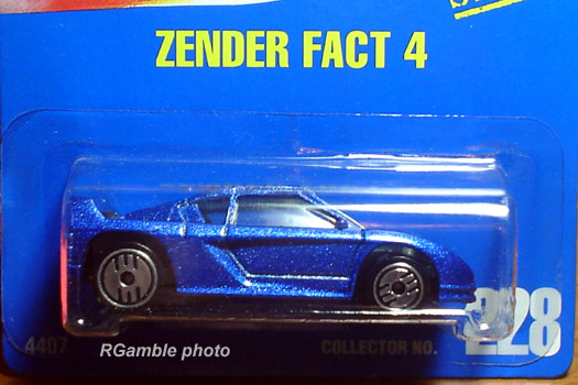 Mtflk. Blue, w/White 'Zender' on hood, Yellow 'Fact 4' on left fender, Grey interior, Clear Window, Black Malaysia Base, w/UH's